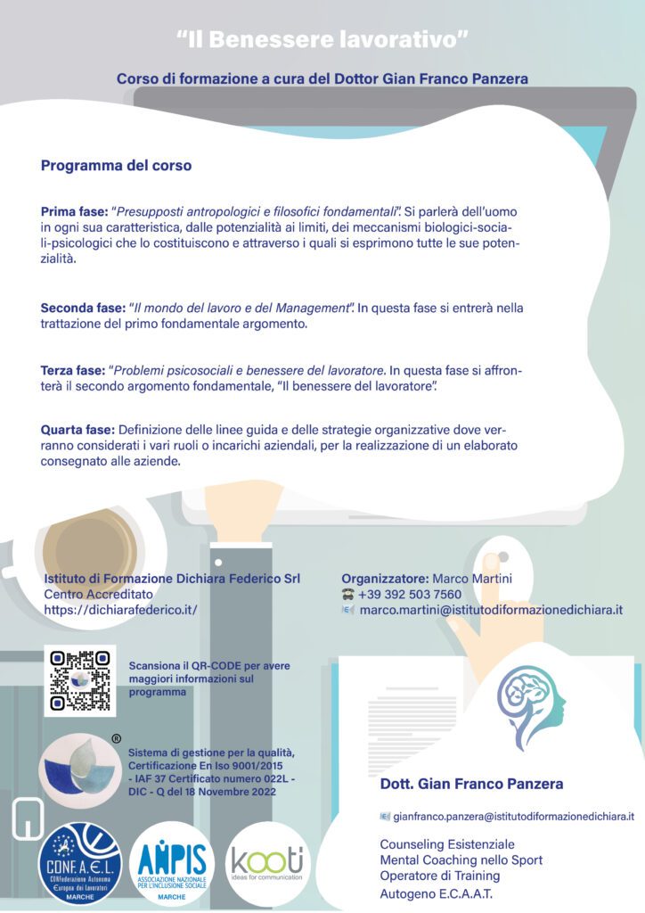Counselor Esistenziale, Consulente in Mental-Coaching nello Sport e Operatore di Training Autogeno qualificato e certificato. Oltre alla disponibilità alle consulenze insegna il Training Autogeno, sia nell’ambito Sportivo che in quello lavorativo che in quello del benessere. E’ iscritto all’albo E.C.A.A.T. (European Committee For The Analytically Oriented Advanced Autogenic Training), che ha rilevanza a livello Europeo, nel registro degli Operatori di Training Autogeno di 1° livello nel settore non clinico. E’ segretario dell’Associazione no profit, le “Fate del Cuore”, e presta la sua disponibilità nella realizzazione di percorsi formativi ed informativi per la cura del benessere personale e sociale.